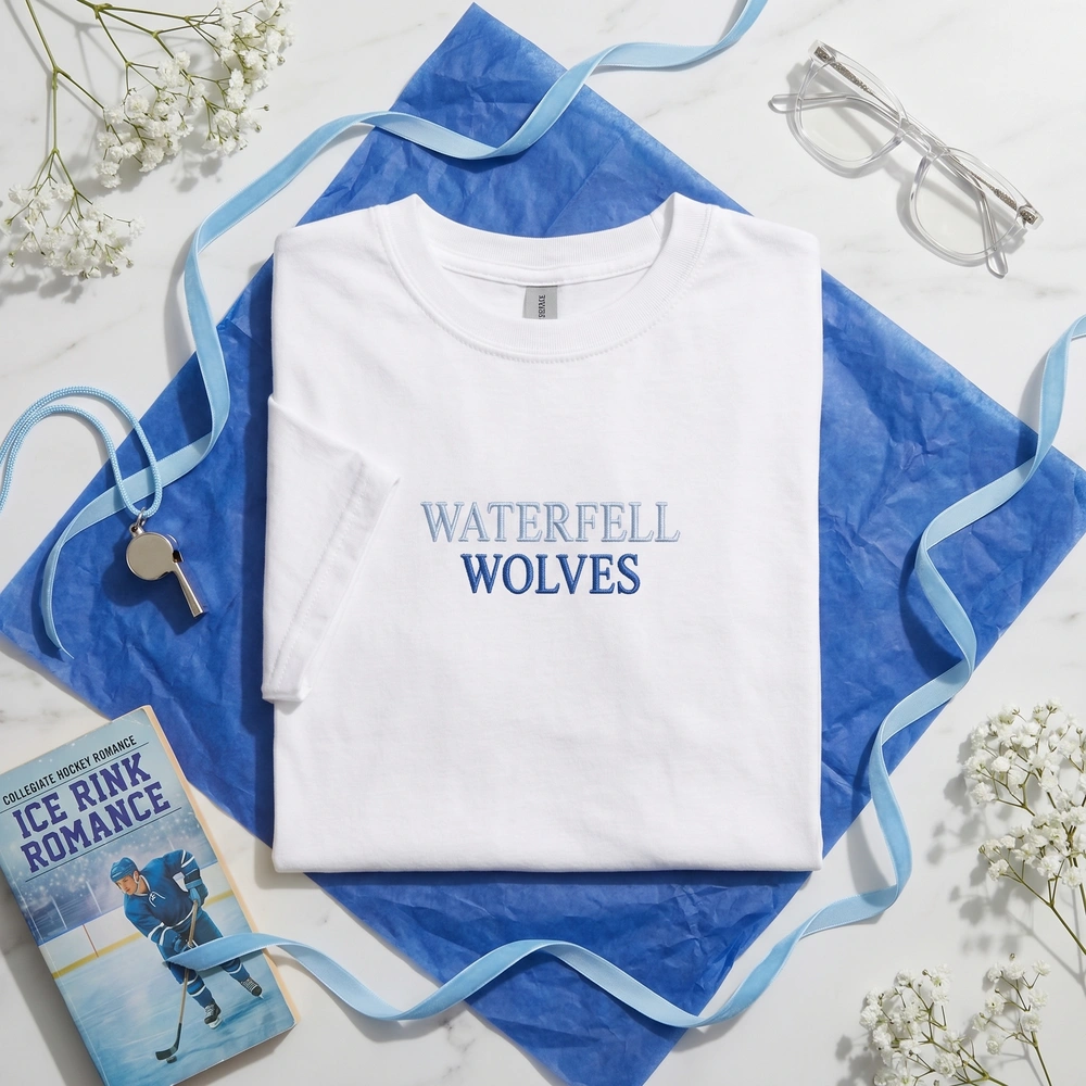 The Waterfell Wolves Embroidered Sweatshirt is a premium collegiate-style top featuring bold athletic lettering, perfect for fans of hockey romance.