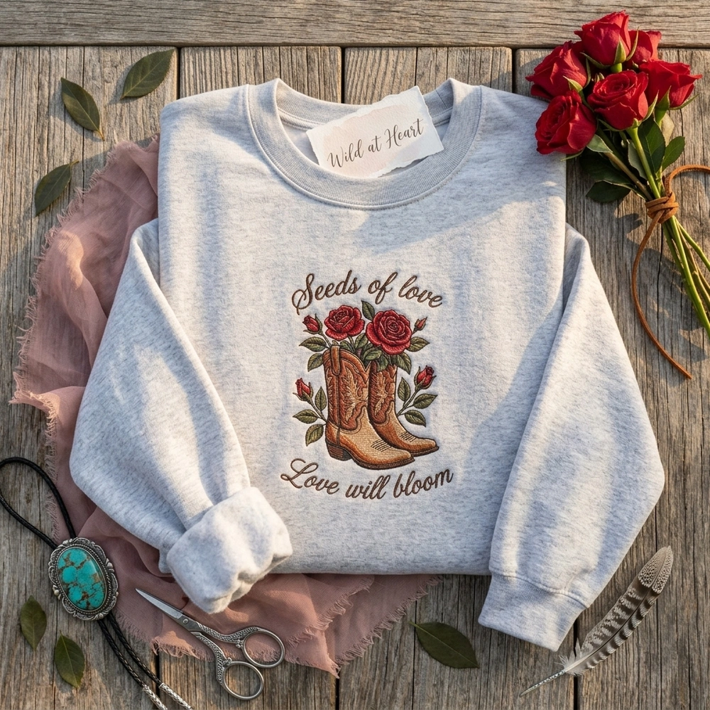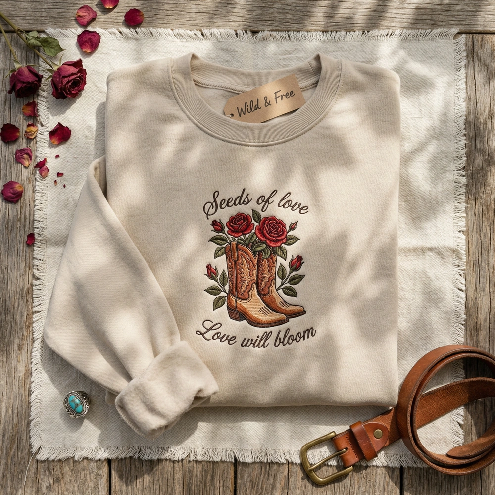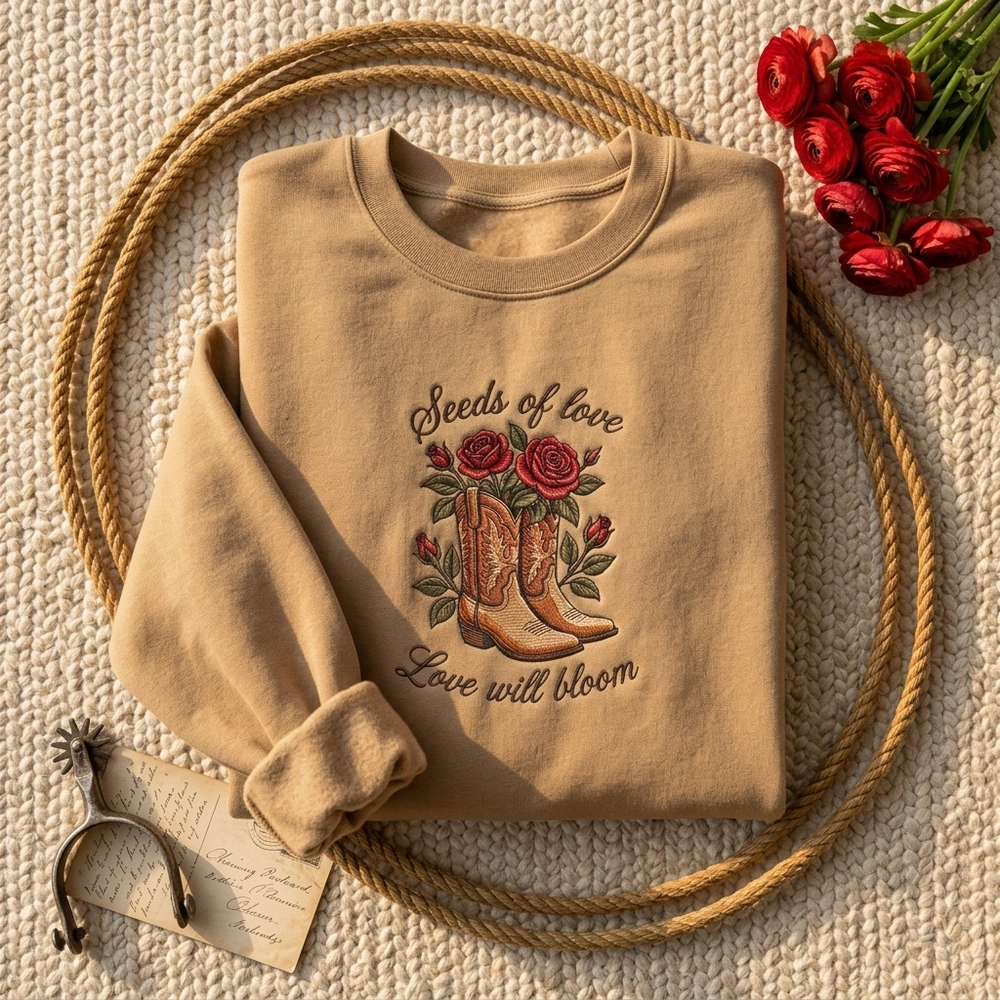 This intricate illustration is brought to life on a premium Cream or Sand colored garment. The design measures 20cm x 25cm and features over six distinct thread colors including Saddle Brown, Indian Red, and Dark Olive Green. We utilize specialized embroidery techniques, including dense satin stitches on the rose petals for a tactile 3D effect, and precise running stitches for the delicate ‘Seeds of love’ and ‘Love will bloom’ cursive text. The vintage-inspired cowboy boots are decorated with traditional stitching patterns, making this a true piece of wearable art.