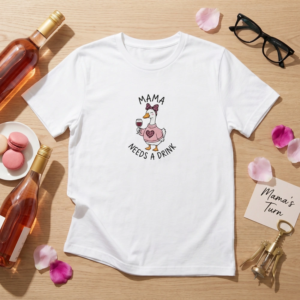 This custom composition features a large 20cm x 25cm center-chest embroidery of a winking white goose. The goose is meticulously detailed, wearing a light pink sweater with a leopard-print heart and a matching hair bow. It holds a classic glass of red wine, rendered in rich magenta thread. The design uses five distinct thread colors (White, Black, Light Pink, Medium Violet Red, and Gold) to create a vibrant, multi-textured finish. We utilize dense tatami stitches for the solid fills of the goose and sweater, while the ‘MAMA NEEDS A DRINK’ typography and sparkle accents are finished in crisp, professional satin stitches for a premium tactile feel on the light pink fabric.