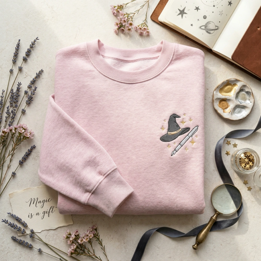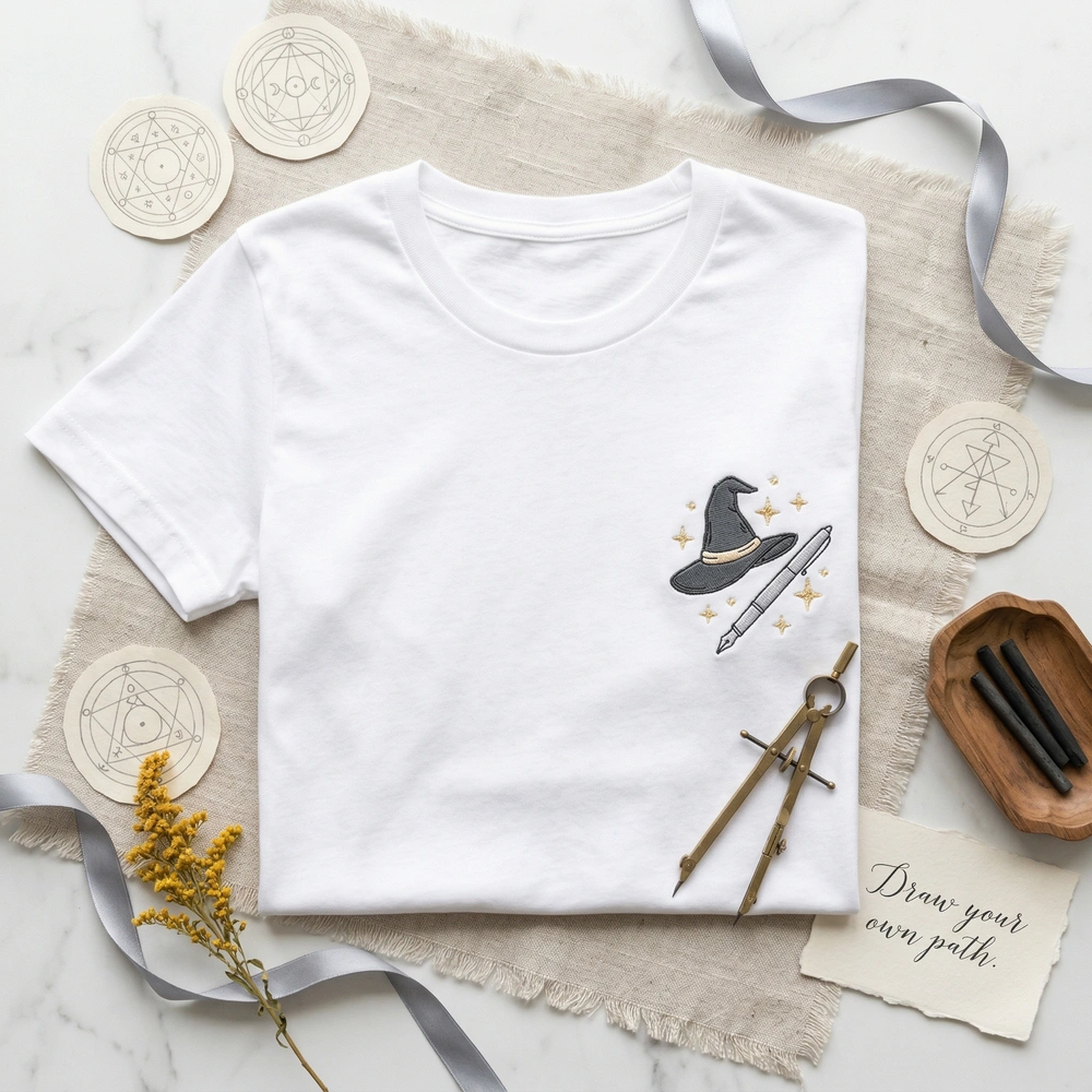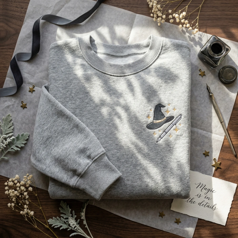 This V2 edition features a precise 8cm x 8cm left-chest embroidery on a premium Sport Grey garment. The design utilizes four high-quality thread colors, including Star Gold, Pastel Cream, Dark Cloak Grey, and Cool Silver, to bring Coco’s magical drawing pen and tilted witch hat to life. The delicate, sparkling stars floating above the quill are stitched with a high density to ensure the magic never fades, even after multiple washes.