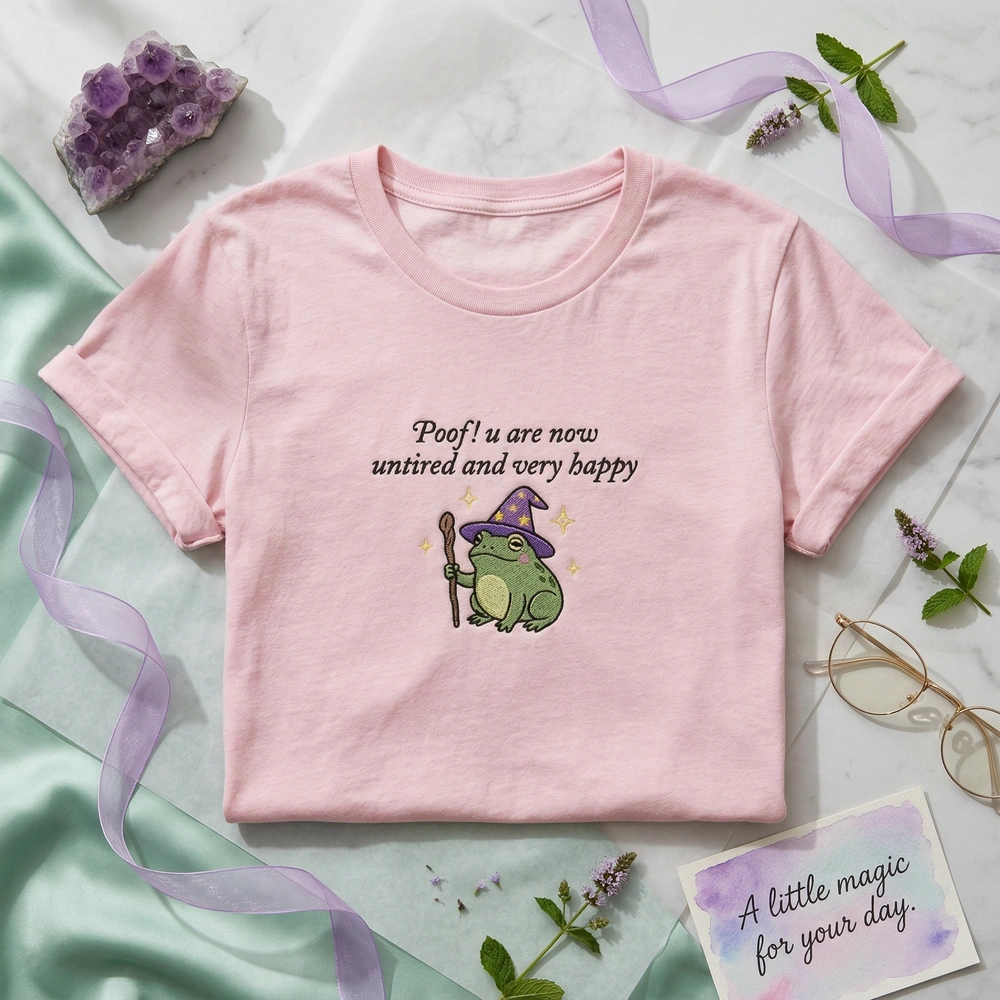 This exclusive design features a 12cm x 15cm center-chest embroidery of a charming forest green frog dressed in a vibrant wizard purple hat adorned with golden yellow stars. Holding a wooden staff topped with a glowing orb, the frog casts a spell of happiness. The text ‘Poof! u are now untired and very happy’ is rendered in a high-contrast black pixel-style font, evoking a nostalgic retro gaming aesthetic. We use 6 premium thread colors and dense tatami fill combined with crisp satin stitching to ensure the design remains vibrant and durable on the neutral sand-colored fabric.