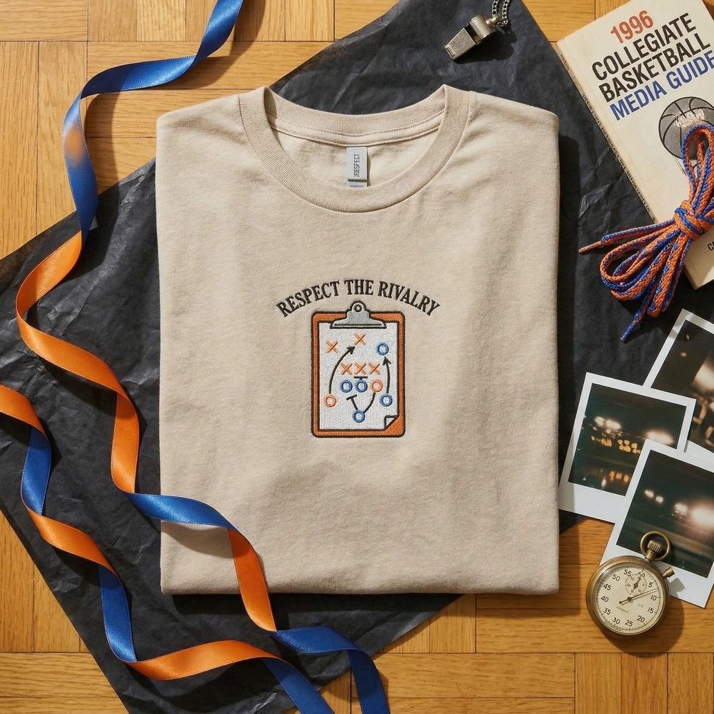 This design is expertly machine-embroidered on a high-quality Sport Grey garment, ensuring both durability and a vintage aesthetic. The embroidery measures approximately 18cm x 22cm, making it a bold centerpiece. We use a premium 3-color thread palette featuring deep Black, vibrant Tennessee Orange, and classic UConn Blue to recreate the high-stakes atmosphere of a 90s sideline. The arched varsity typography and detailed clipboard marker strokes provide an authentic collegiate feel that mimics genuine 90s sports gear.