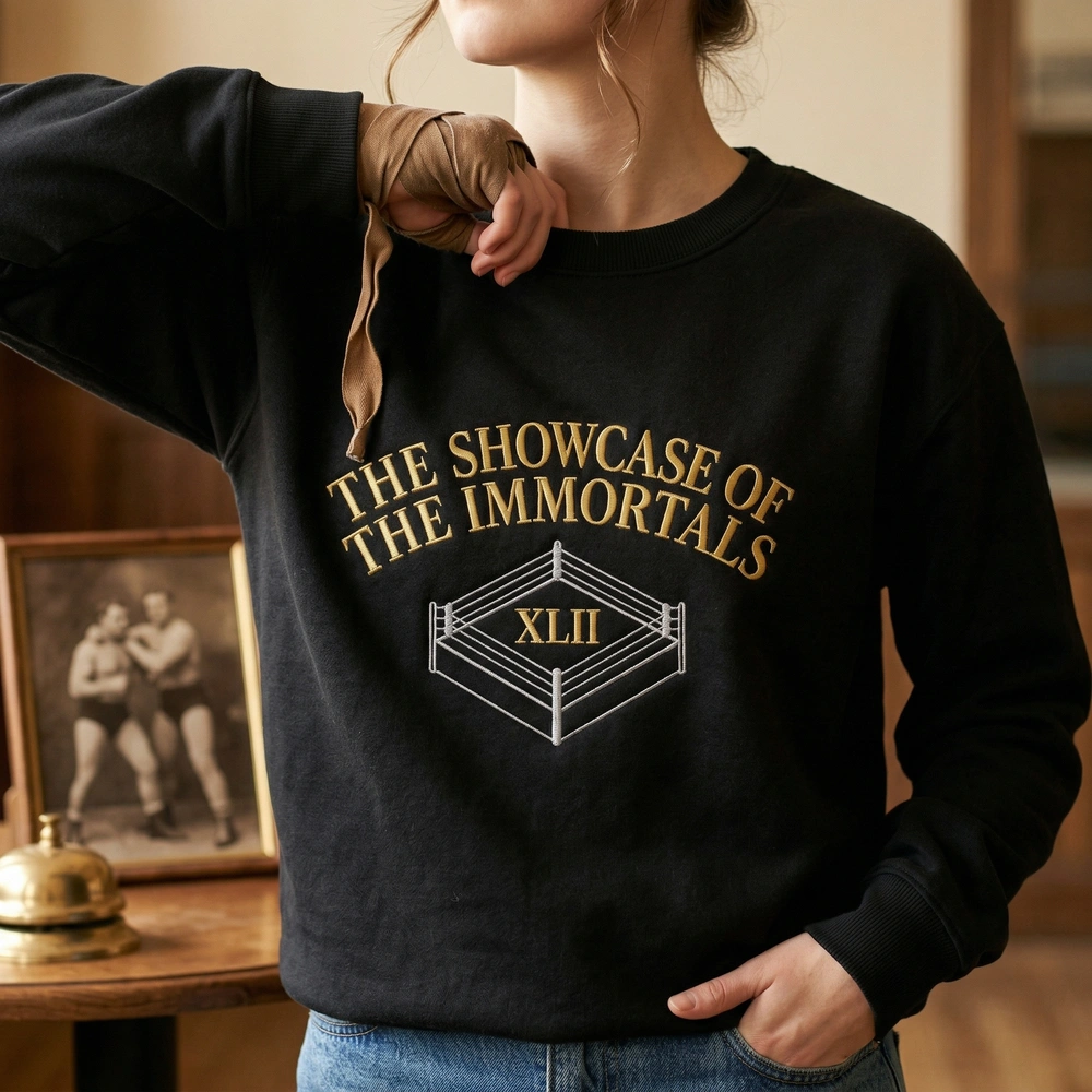 The Wrestling Event Sweatshirt is a premium machine-embroidered sweatshirt featuring the ‘Showcase of the Immortals’ design—perfect for pro wrestling fans.
