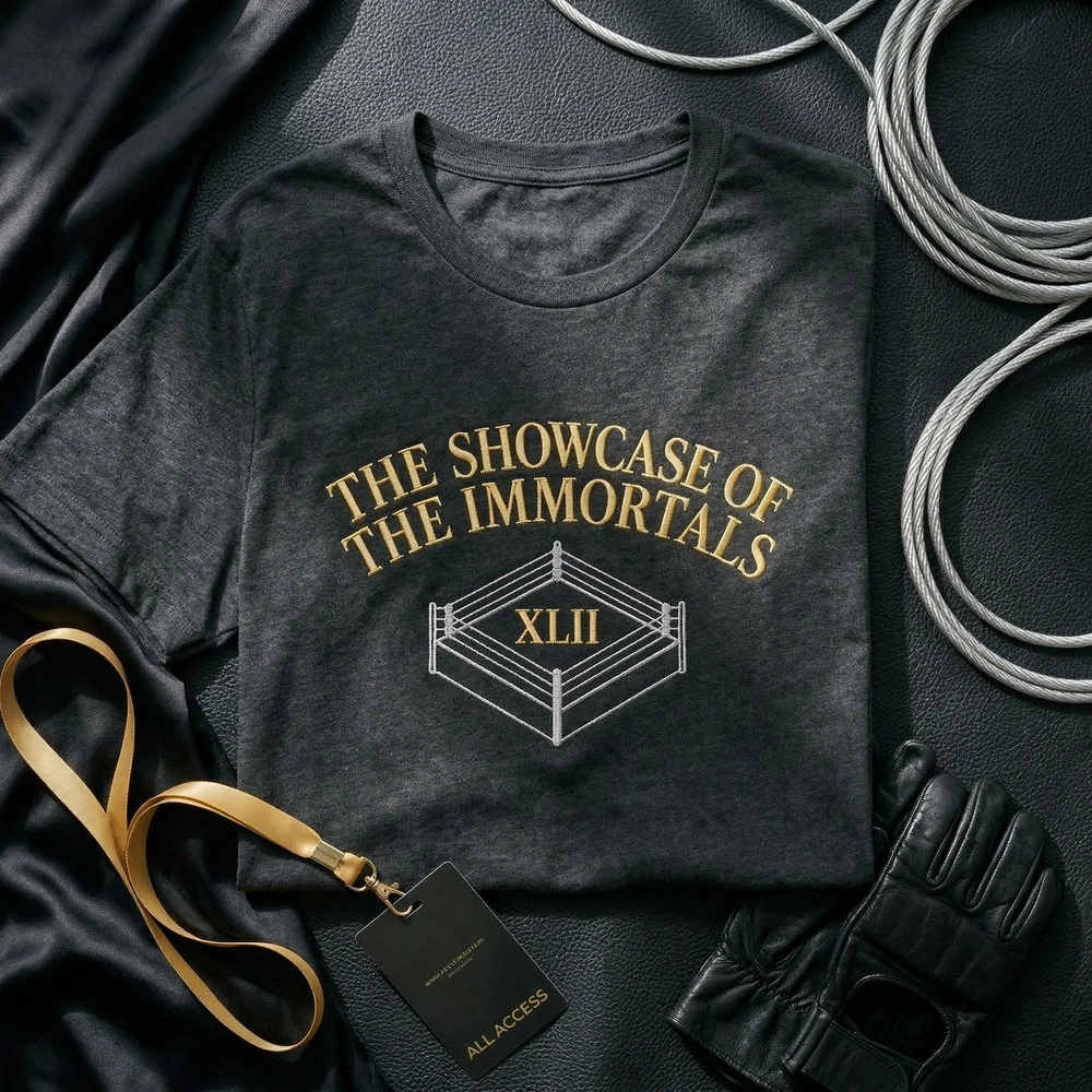 This exclusive design features a massive 22cm x 16cm center-chest embroidery. The ‘THE SHOWCASE OF THE IMMORTALS’ text is rendered in a classic varsity-style arched font using Championship Gold thread. Below the text, an intricate minimalist outline of a wrestling ring is captured from an isometric angle, featuring the Roman numerals ‘XLII’ in bold Steel Silver and White metallic-style thread. The premium black garment provides the perfect high-contrast canvas for these three distinct thread colors, giving it the feel of an authentic collegiate or boxing gym training piece.