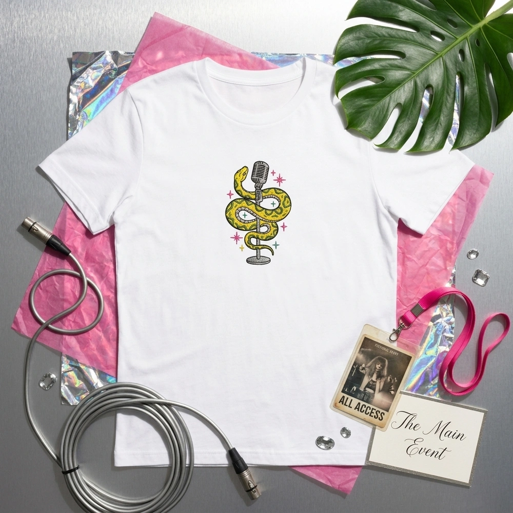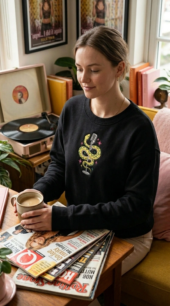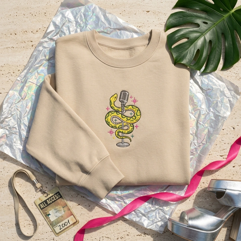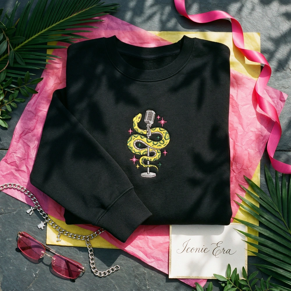 This premium black garment serves as the perfect canvas for our intricate machine embroidery. The design measures 15cm x 20cm and features five distinct thread colors: Python Yellow (#FFD700), Dark Green (#006400), Silver (#C0C0C0), and Hot Pink (#FF69B4) for the Y2K-style starbursts. The silver microphone stand is tightly coiled by a textured yellow python, detailed with green and black scale patterns that provide a striking 3D effect. Every stitch is placed with precision to ensure the design remains crisp and vibrant after every wash.