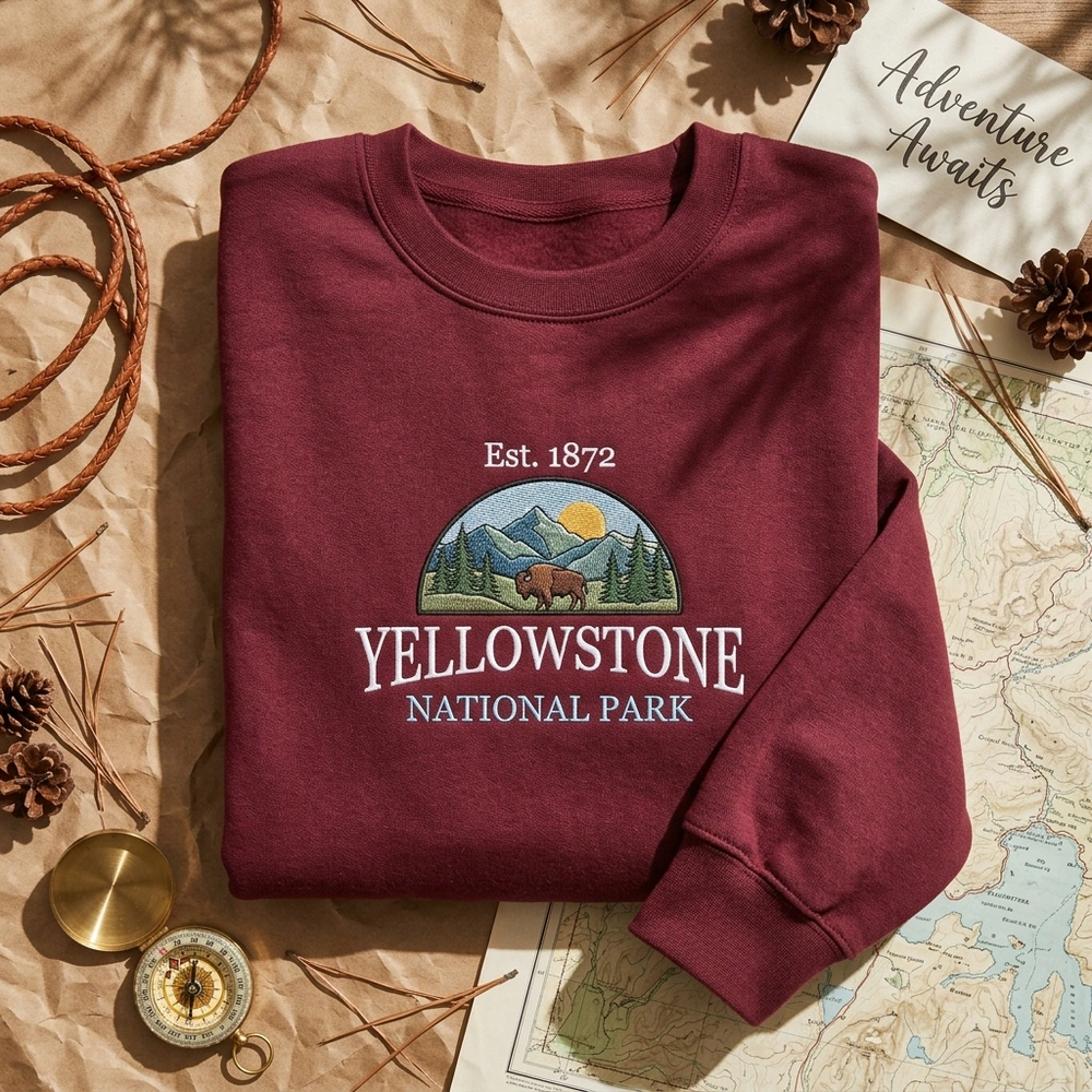 Carry a piece of America’s first national park with you wherever you go. This maroon vintage hiking shirt evokes a sense of nostalgia and adventure, making it the perfect companion for your next outdoor excursion. Whether you’re a seasoned camper or a fan of the vintage aesthetic, this piece stands out as a high-quality alternative to standard printed souvenirs. Browse more embroidered sweatshirts or find your next fishing sweatshirt in our curated collection.
