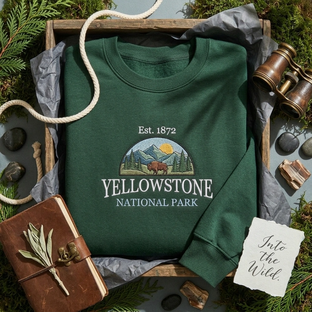 The Yellowstone sweatshirt is a premium machine-embroidered sweatshirt featuring a vintage bison landscape—ideal for national park apparel lovers.