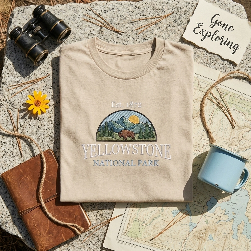 This design pays homage to Yellowstone National Park, established in 1872 as the first national park in the world. It captures the iconic “Gorpcore” and vintage outdoorsy aesthetic currently trending in travel fashion.