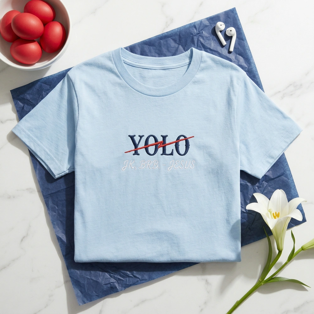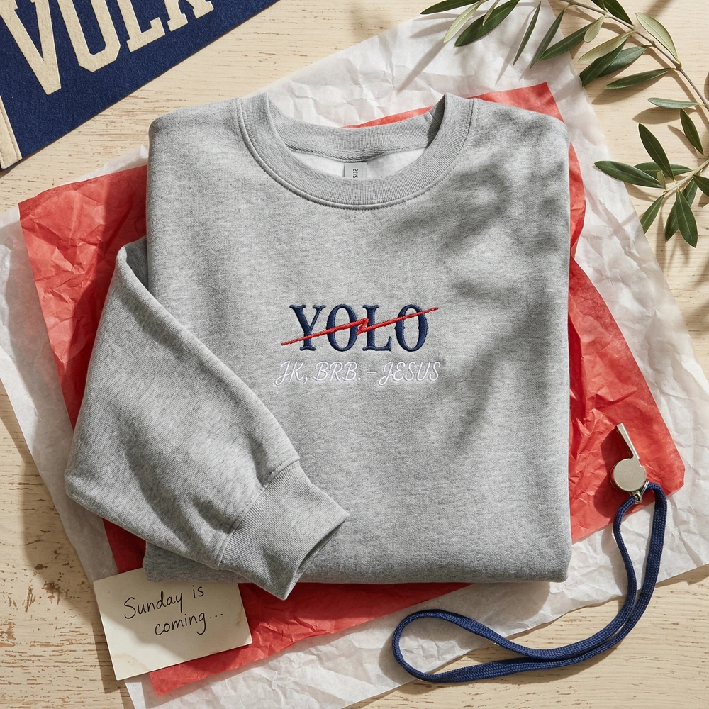 This design features high-density embroidery measuring 25cm x 15cm, centered on the chest of a comfortable Sport Grey garment. We use three distinct thread colors to achieve the look: #1C2833 Varsity Navy for the bold block letters, #E74C3C Strikeout Red for the jagged “YOLO” line, and #FFFFFF Outline White for the clean “JK, BRB. – JESUS” punchline. The contrast between the serious collegiate typography and the casual internet slang creates an instantly readable, ironic aesthetic.