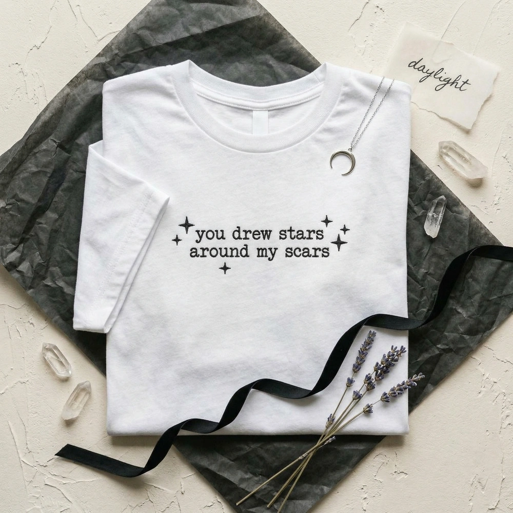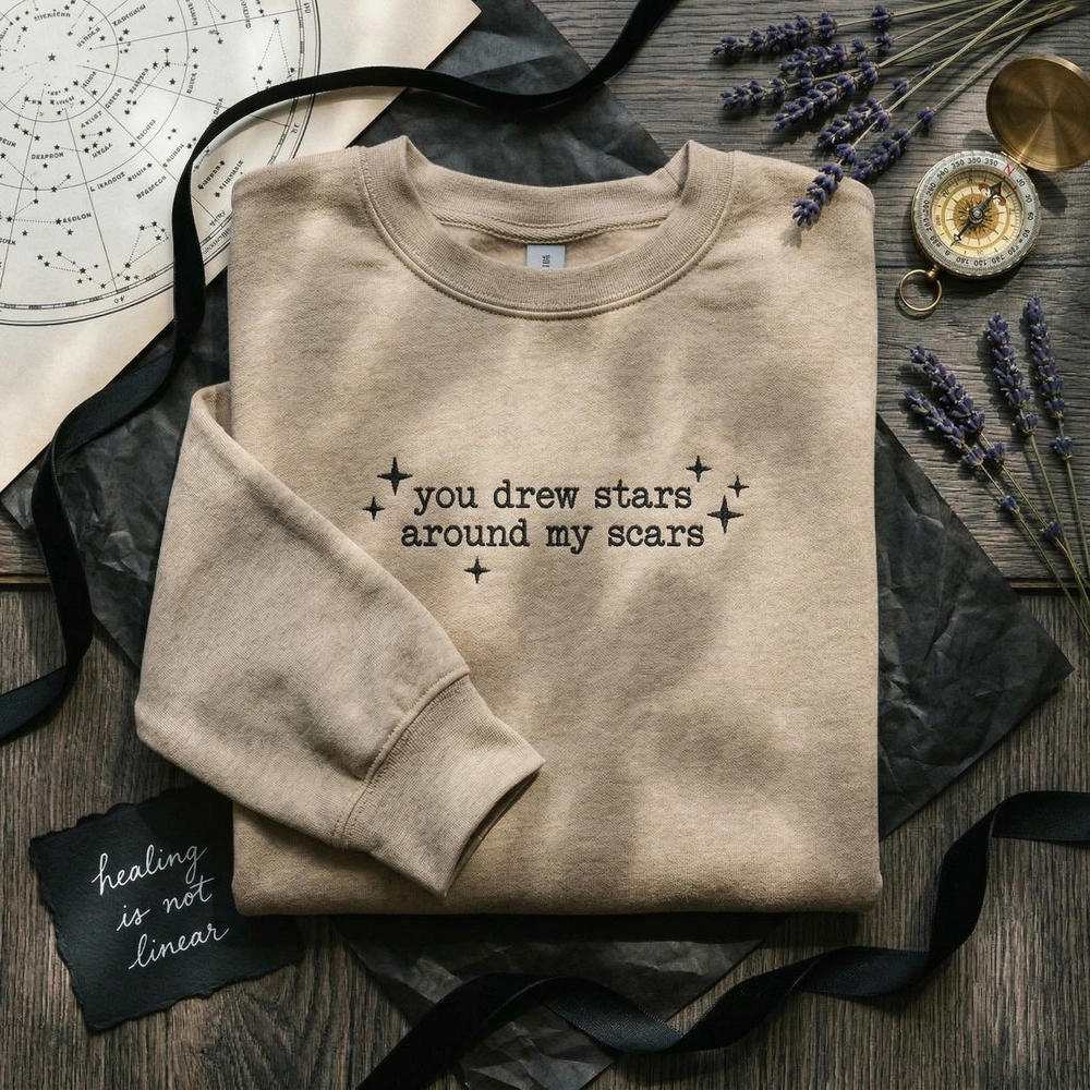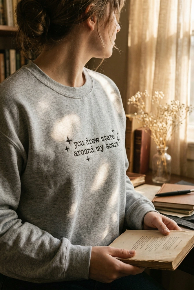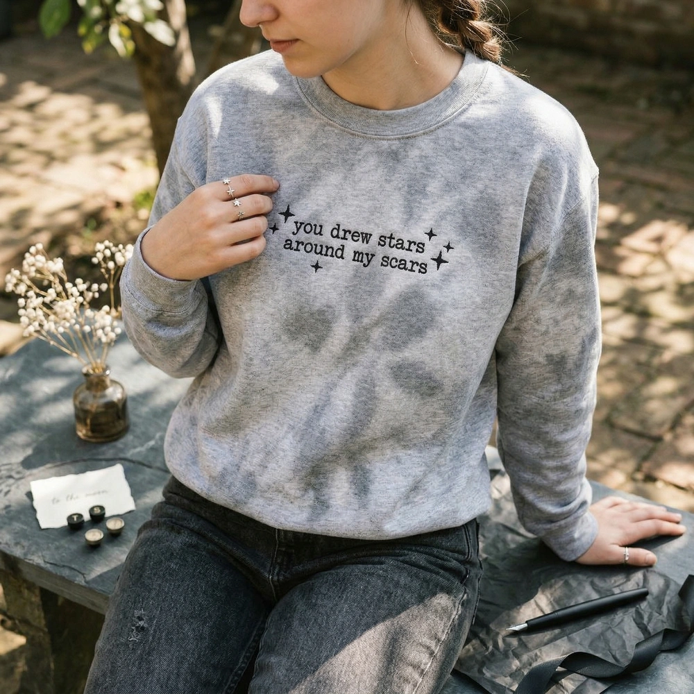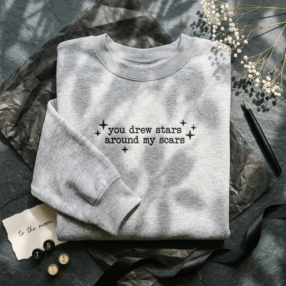 The You Drew Stars Around My Scars Embroidered Sweatshirt is a premium machine-embroidered garment featuring minimalist typewriter text—the perfect gift for music fans.